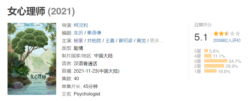 《女心理师》从故事到阵容再到物料风格,都营造出一种高端现实题材的感觉,将群众期待值一再调高,以至于正片见光死,被指过于悬浮。在烂剧效应下,不仅导演柯汶利滑铁卢,杨紫也遇到了更严格的审视,暴露出许多问题:脸僵滤镜重、造型同质化,外型撑不起职业精英,表演达不到类型要求。
