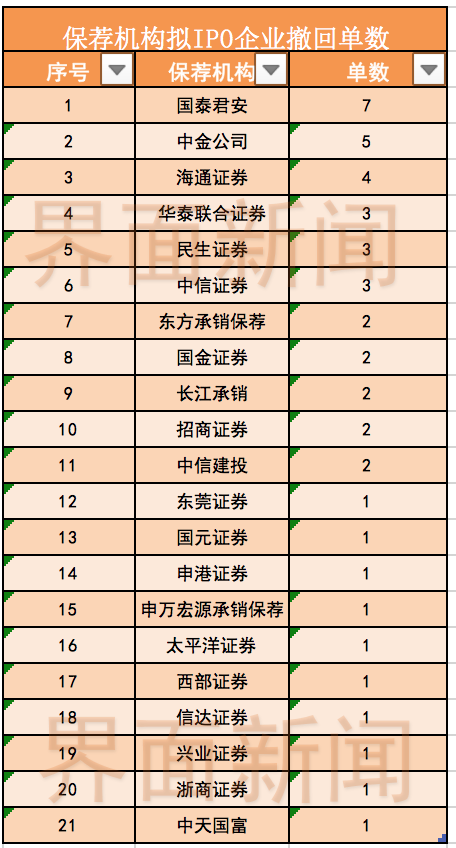 从保荐机构分布来看,撤回数量最多的是国泰君安,7家IPO终止,其次是中金公司,5家IPO终止,再次是海通证券,4家IPO终止。此外,华泰联合证券、民生证券、中信证券也分别有3家IPO终止。