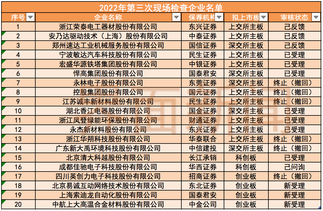 7月15日,中证协发布的第三批首发申请企业现场检查抽查名单显示,涉及企业共有20家。具体来看,有14家为沪深主板IPO企业,4家创业板企业,2家科创板企业。