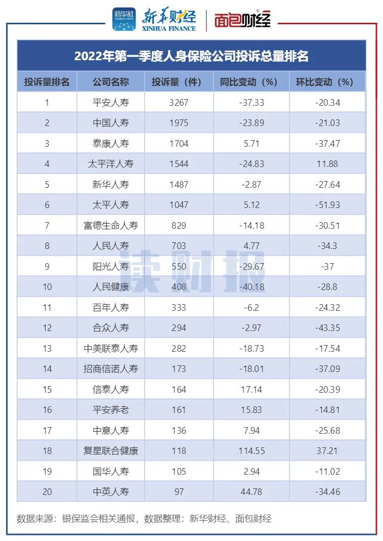 与2021年四季度相比,人身保险公司的投诉量普遍下降,仅复星联合健康和太平洋人寿的投诉量环比出现增长,增幅分别为37.21%和11.88%。