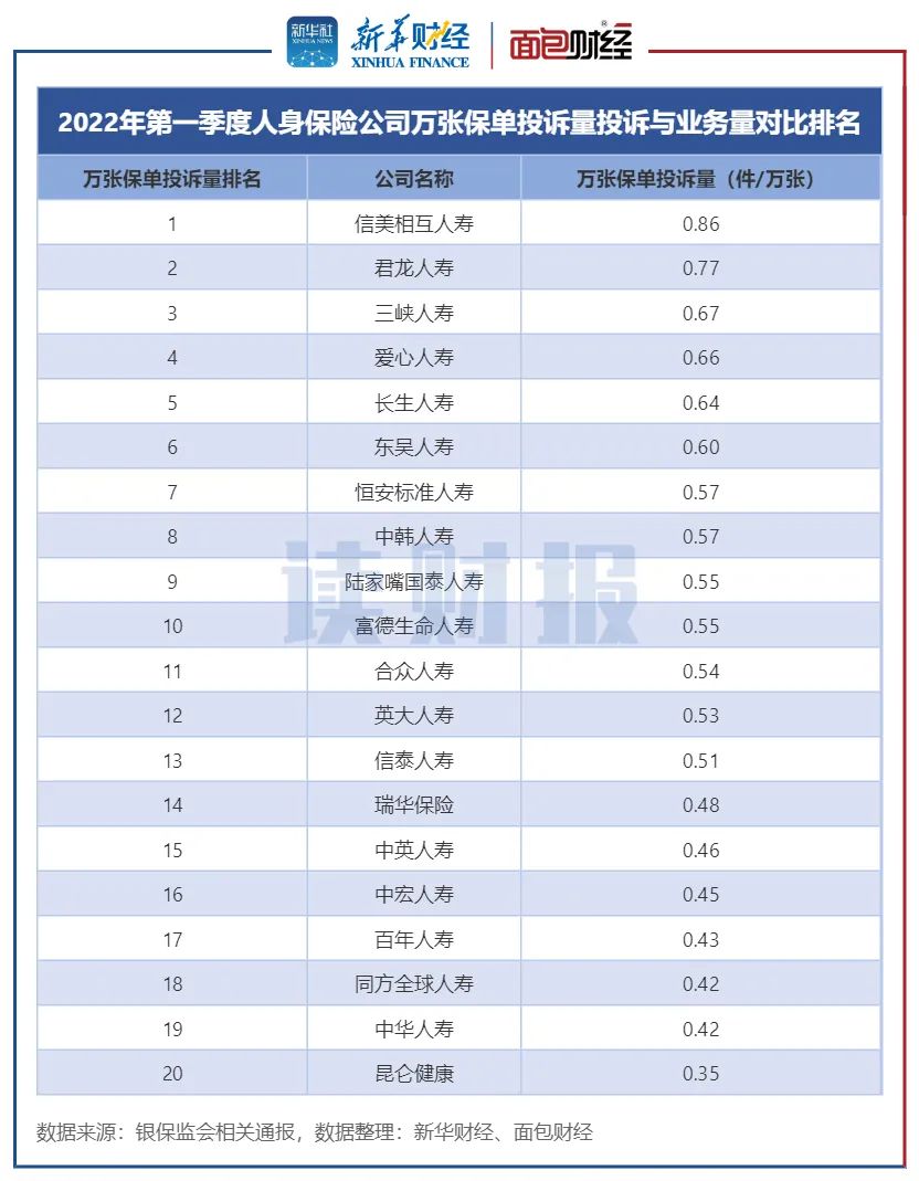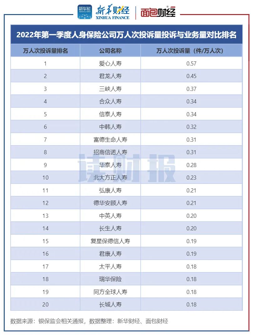 从人身保险公司投诉与业务量的对比数据来看,2022年一季度,复星联合健康、中美联泰人寿的亿元保费投诉量位列人身保险公司前两位;信美相互人寿的万张保单投诉量位列人身保险公司第一;爱心人寿的万人次投诉量位列人身保险公司第一。