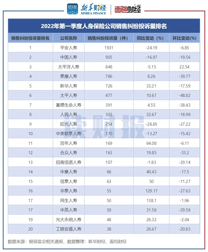 2022年第一季度,平安人寿、中国人寿和太平洋人寿保险公司的销售纠纷投诉居前三。投诉量分别为1931件905件和848件。