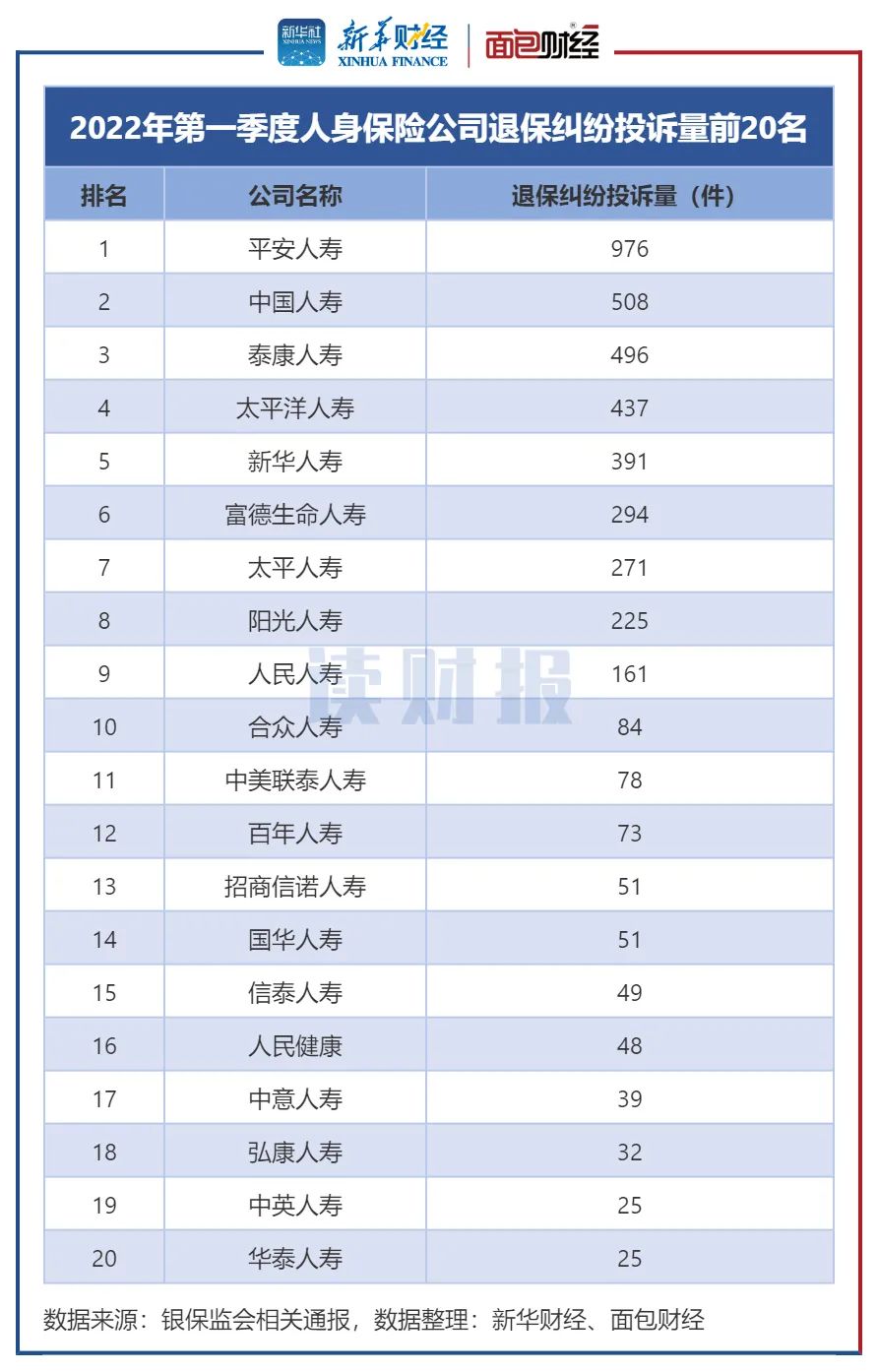 2022年第一季度,平安人寿、中国人寿、泰康人寿、太平洋人寿和新华人寿的退保纠纷排在前五位,投诉量分别为976件、508件、496件、437件和391件。