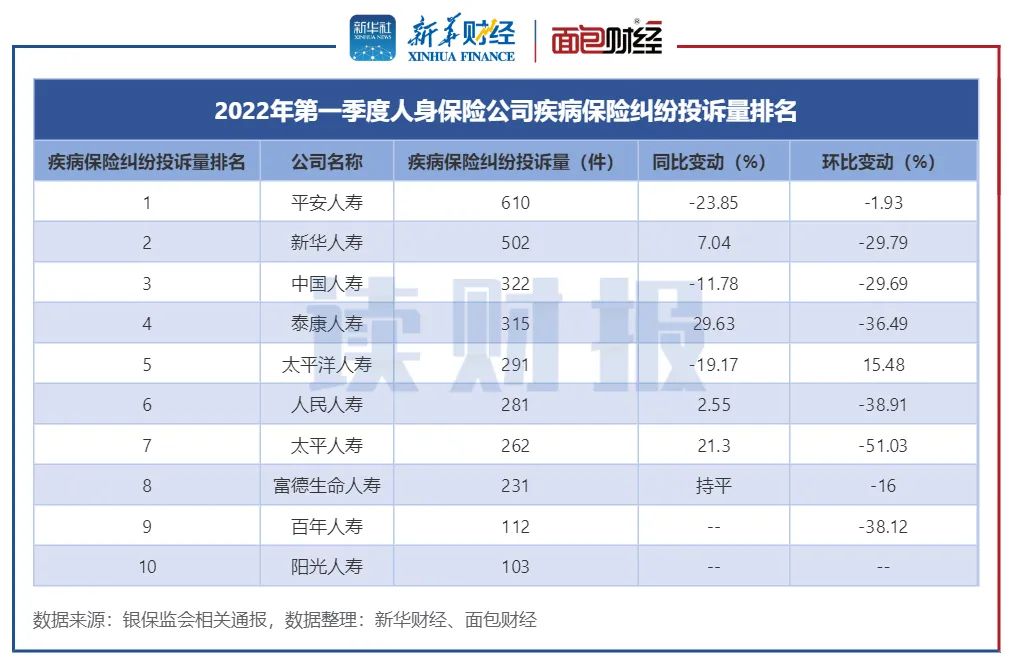 从疾病保险纠纷投诉量来看,平安人寿、新华人寿和中国人寿2022年第一季度的疾病保险纠纷投诉量位列人身保险公司前三位,分别为610件、502件和322件。