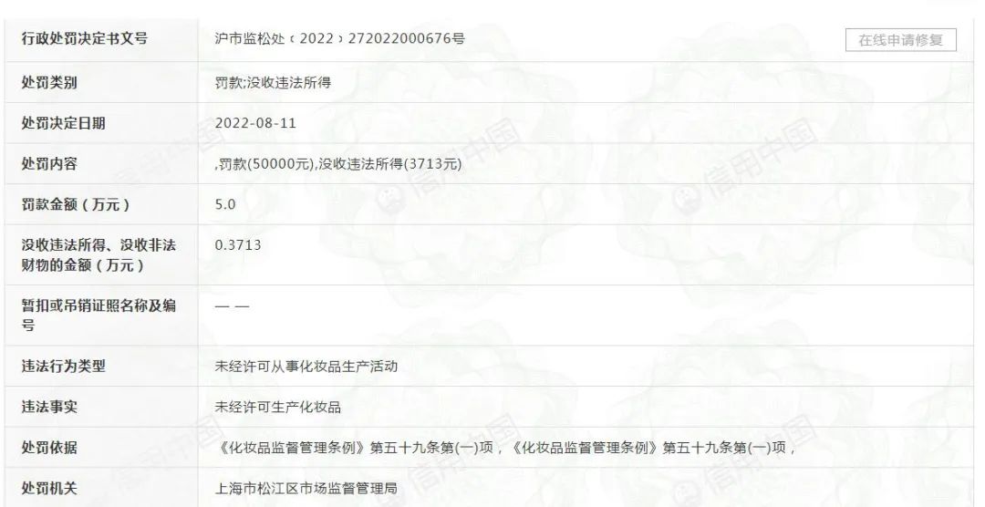 据上海市市场监管局消息,近日,上海左右化妆品有限公司被上海市松江区市场监督管理局处罚,原因是未经许可从事化妆品生产活动。