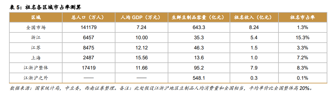 祖名的生鲜豆制品以中高端产品为主,并连续多次对主要产品进行提价,虽然相较于其他行业,品牌溢价的绝对值较低,但作为日常食用食材,脱离一二线城市后,仍然缺乏价格优势。根据豆制品专业委员会数据,2019年50强规模豆制品生产企业相对集中在东部、中部和南部具有豆制品消费传统且经济发达、人口密度大的地区。其中,华东地区企业数量最多,占比40%,西南地区占比20%,华北地区占比10%,华南地区占比8%,华中地区占比14%,东北地区占比8%。这意味着往西往北,经济水平逐渐走低,人口密度变小,地区仍以消费小企业、小作坊的廉价豆制品为主。