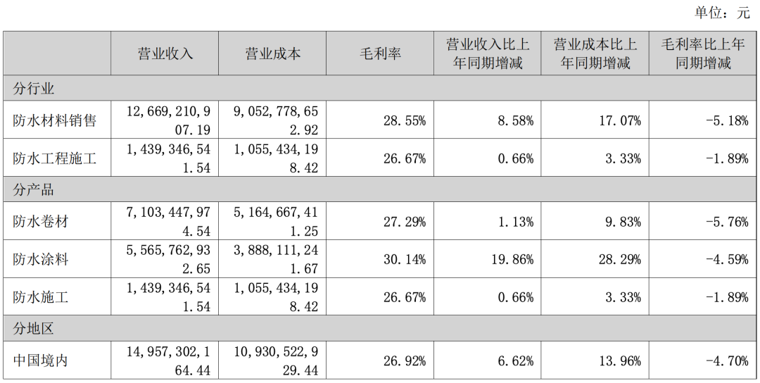 若按照产品来看,虽然防水卷材仍为主力产品实现了71.03亿元营业收入,但防水涂料逐步发力,营收同比上涨19.86%,至55.66亿元,但营业成本却同比增长28.29%。