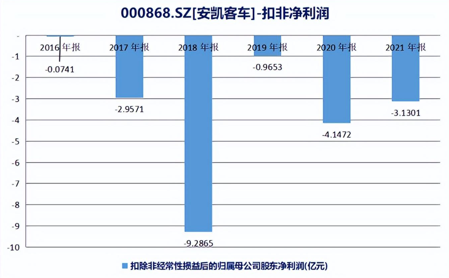 自2016年以来,安凯客车主业就发展不力,扣非净利润连续6年亏损,其中2018年亏损9.286亿元。2020年,安凯客车净利润9958万元,主要是因政府收储而处置的土地厂房,获得资产处置收益3.91亿元,扣非净利润依然亏损4.147亿元。
