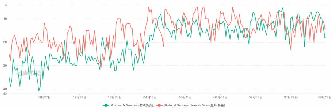与投放量相反的是五款产品的收入情况,从七麦数据抓取的数据可以看出,《State of Survival》、《Puzzles &Survival》两款产品在美国市场iOS畅销榜都有明显的上升,前者从前三个月徘徊在25左右的名次,稳定至TOP20行列;后者,同样从35左右的名次,发力至TOP10之中。