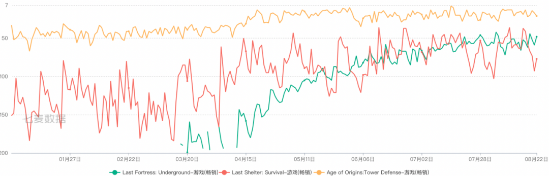 《守望黎明》、《Last Fortress: Underground》、《Age of Z》这三款产品的上升幅度就较为惊艳。