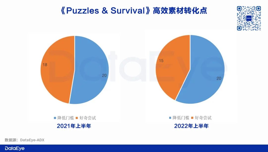 2022年上半年,《Puzzles &Survival》在转化点上,仍是以“降低门槛”以及“好奇尝试”为主,但不同的是,素材的内容传递方式有所改变。多会调动玩家的情绪,注重通过创意素材给玩家“戏剧性”的游戏体验,例如以故意失败的方式,让玩家产生“这么简单也失败,让我来”的想法。