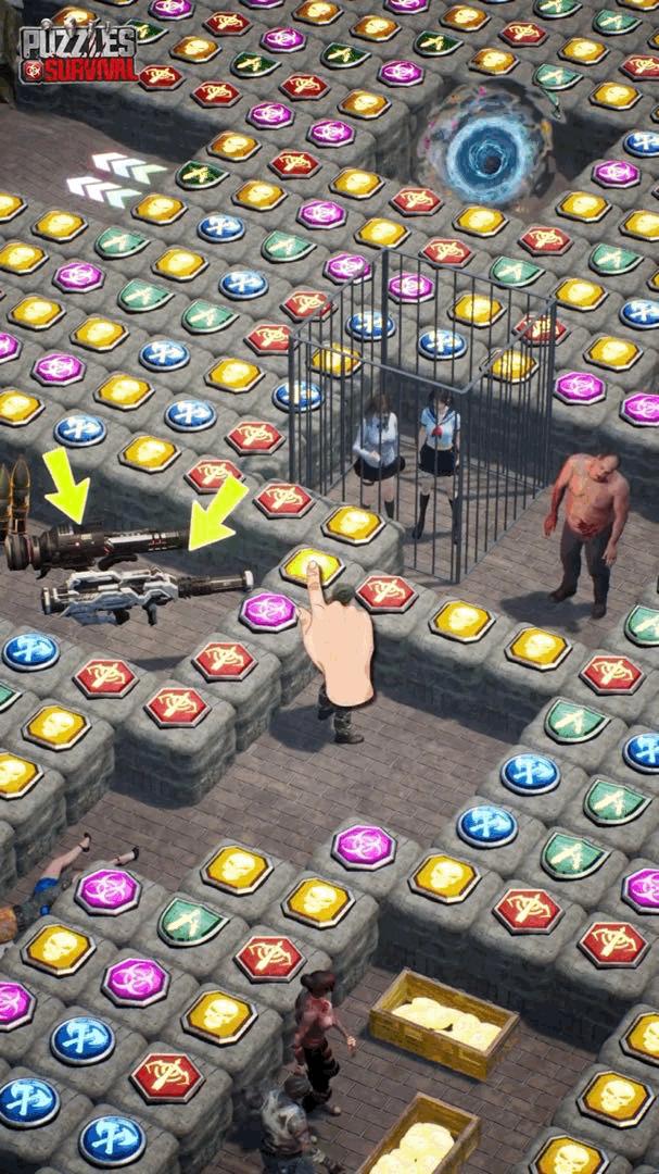 到了2022年,《Puzzles &Survival》在吸睛点上最明显的变化在于素材的消除玩法从3D画面转向2.5D画面,这样的好处在于让消除玩法占据素材90%的屏幕,能更直观的将游戏核心玩法展现给玩家。