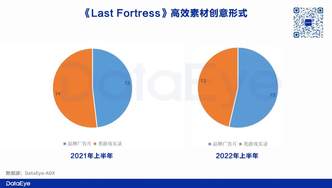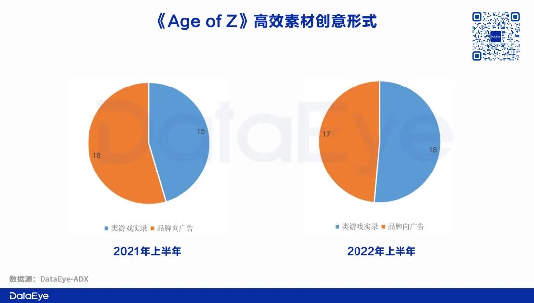 到了2022年,小游戏素材广告占据了一半的比例,所以今年的素材创意,“品牌向广告”与“类游戏实录画面”的占比近乎五五分。