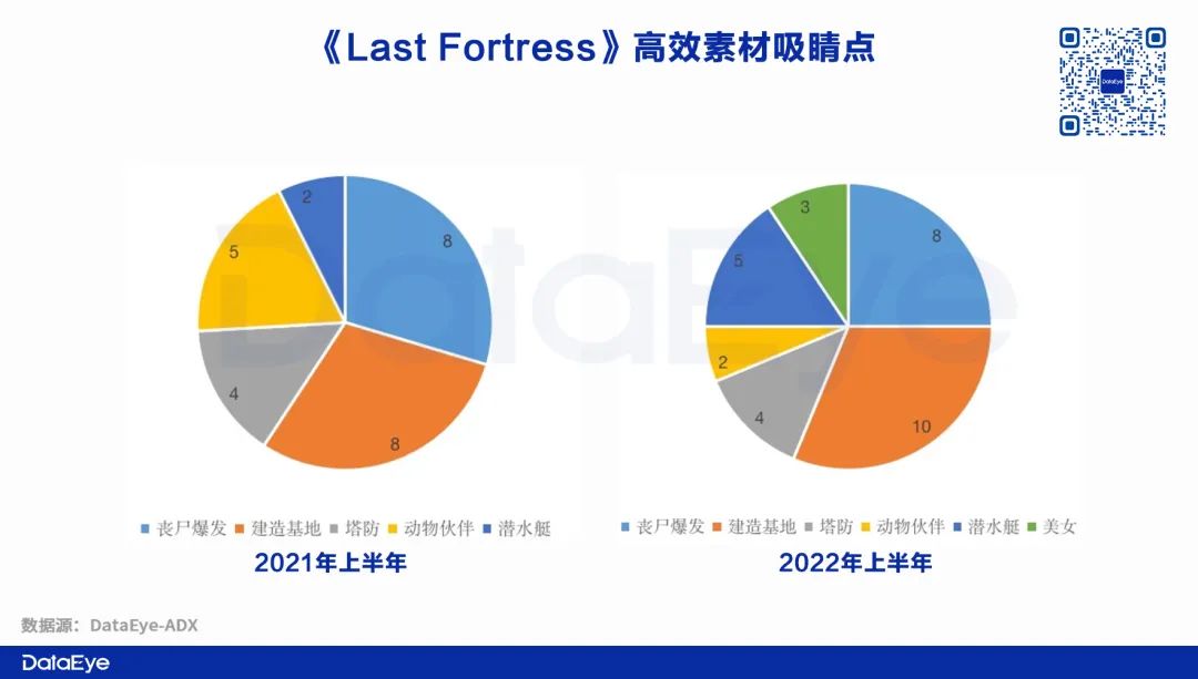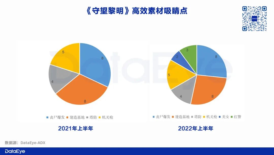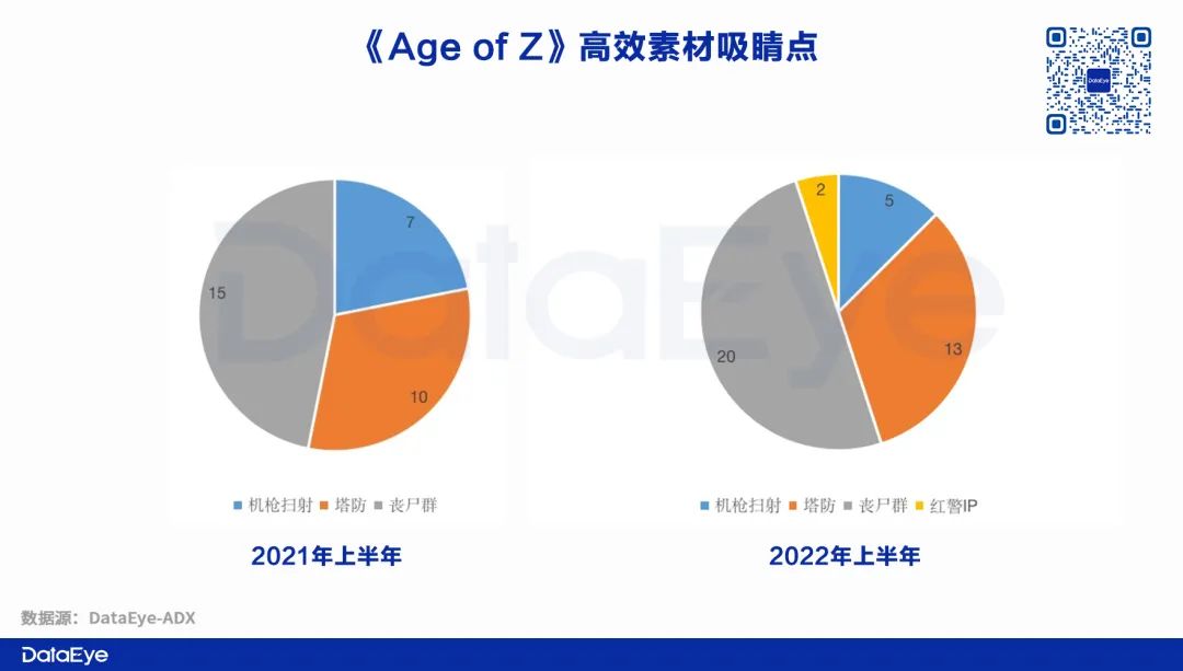 2021年,《Age of Z》高效素材的吸睛点以“长期兴趣”为主抓方向,但具体到素材的呈现上,则会有不同的侧重点。比如TOP10的高效素材中,有9组素材都采用“丧尸群”、“机枪扫射”、“塔防”等元素。