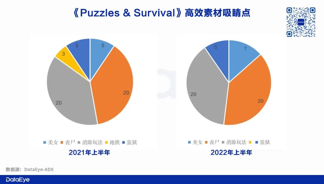 2021年上半年,《Puzzles &Survival》高效素材在吸睛点上,多是以用户的长期兴趣为切入点,这里主要指的是“丧尸”、“美女”、“消除玩法”等元素。具体在创作上,游戏会在素材前半部分制作动画短片,吸引用户的观看,后半部分则以展现消除类玩法为主。