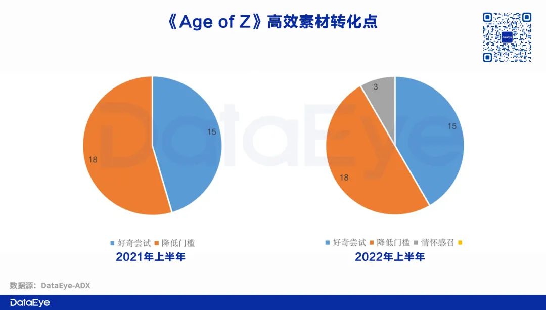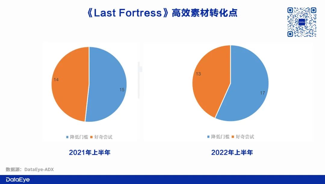 2021年的素材在转化点上多侧重在“降低门槛”、“好奇尝试”两个方面,前者是通过代入玩家视角,模拟游戏实录画面,让玩家通过素材就可以看到游戏核心玩法;后者则是用多种元素的展现及组合,让玩家产生好奇心。2022年,在转化点上,整体与2021年相比变化不大。