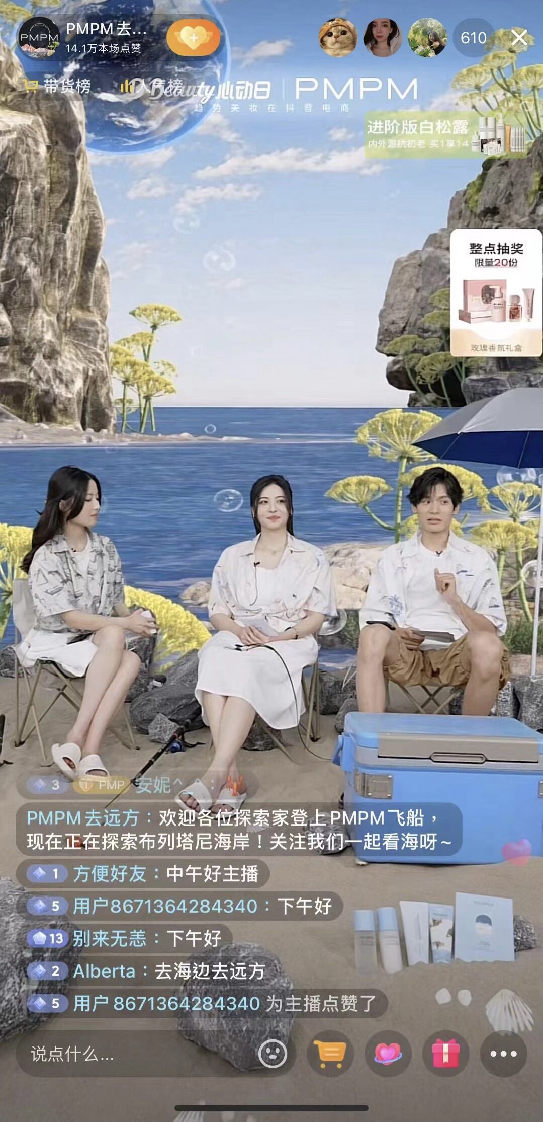 以本土新兴护肤品牌PMPM为例,该品牌曾通过开设@PMPM去远方账号来做聊天访谈式的自播内容,聚焦于旅行、情感、户外休闲等年轻人热点议题。此前,PMPM还直播过去布列塔尼海岸看海,以及去皮埃蒙特森林寻找白松露等活动,并借助这些非常规的直播内容来传递品牌精神。