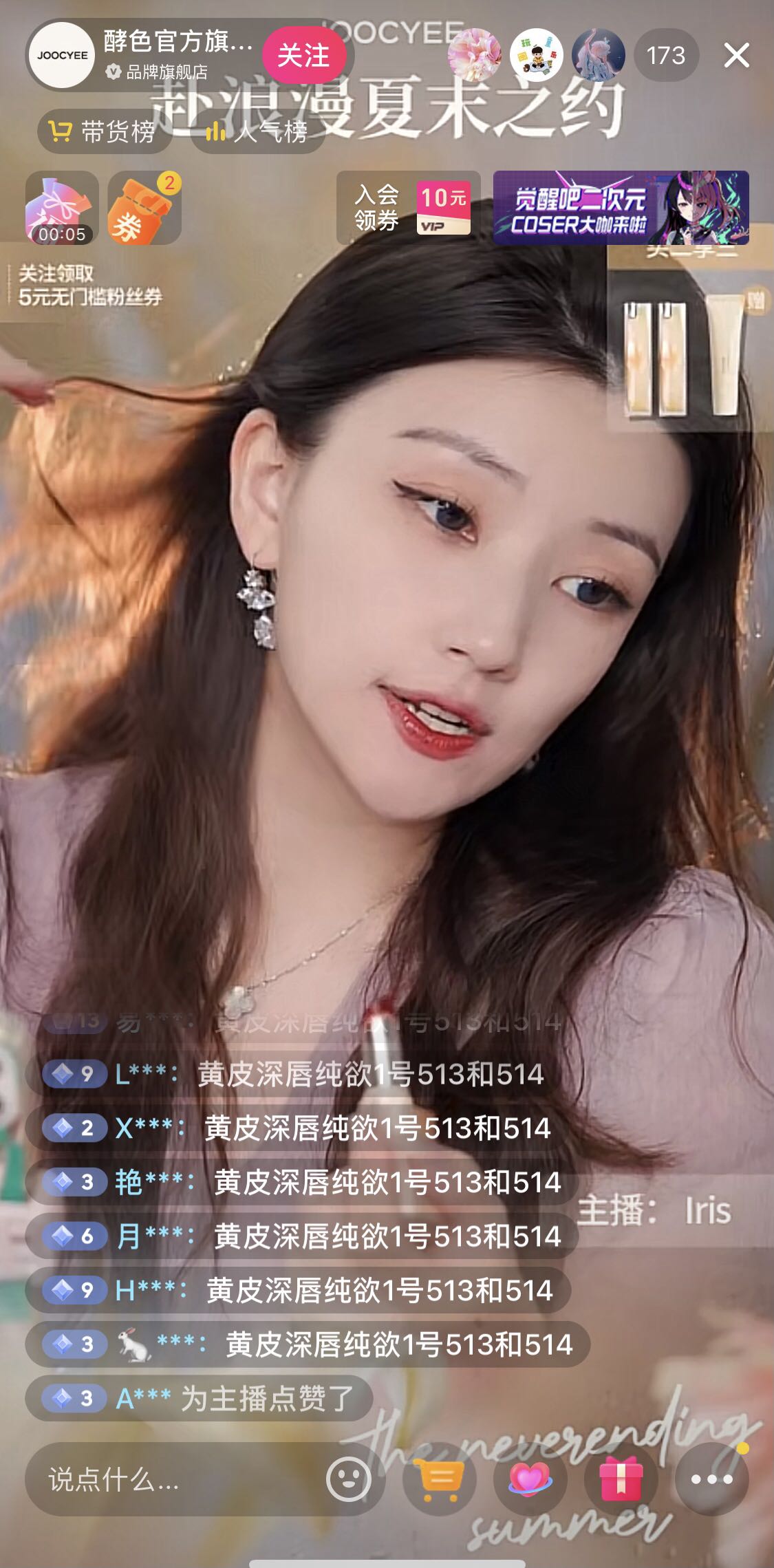 比如,酵色会在一个直播间主要呈现面部的妆容效果,而另一个直播间的取景会展示主播的半身形象,营造一种氛围感。