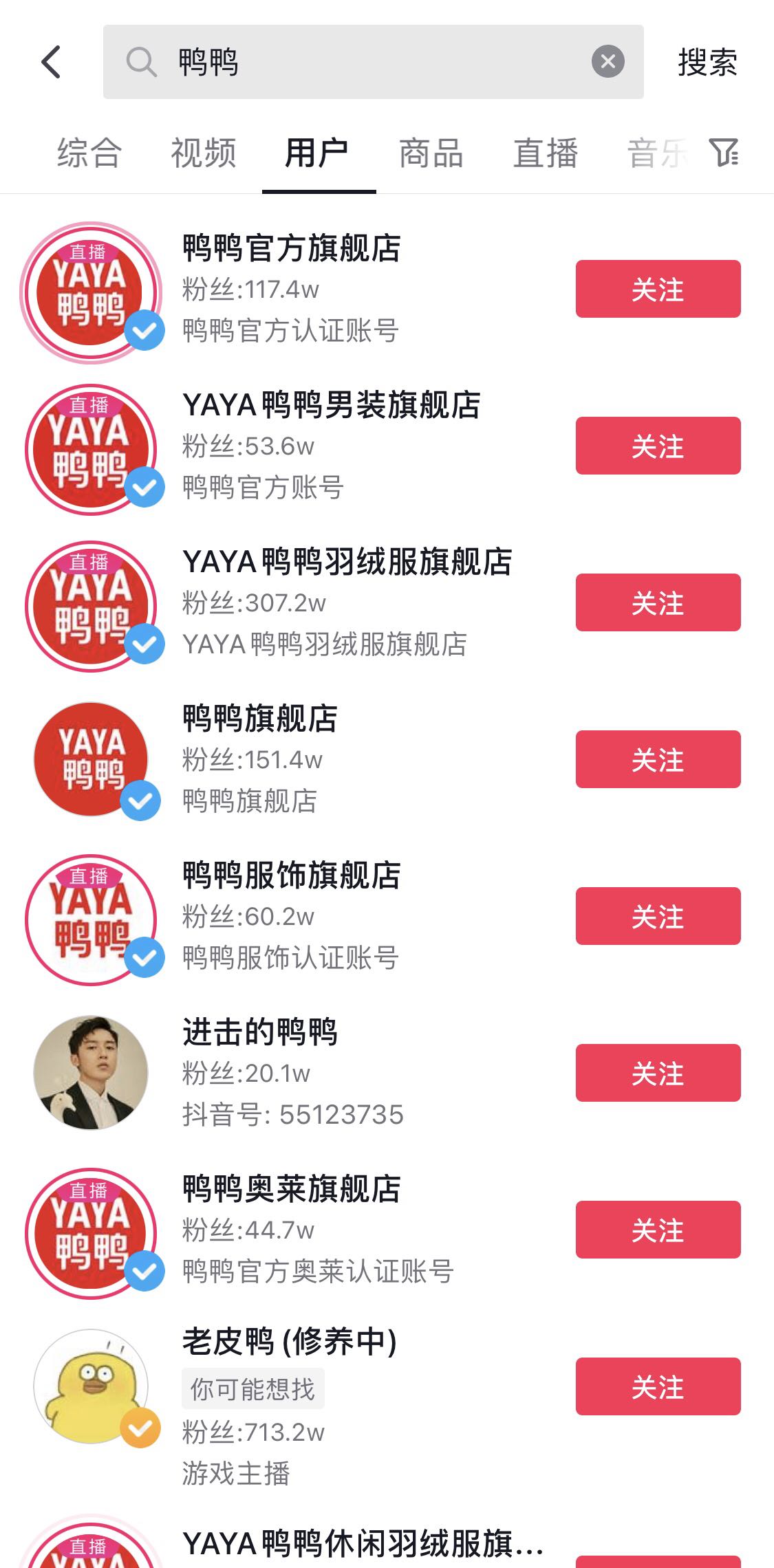 鸭鸭品牌总监胡诗琦对界面时尚表示,2020年中鸭鸭在抖音做达播快速实现冷启动后,当年11月受抖音邀请又开始尝试自播,并陆续开设了多个店铺账号用以测试。目前在抖音搜索鸭鸭品牌,可以看到“鸭鸭官方旗舰店”、“鸭鸭女子旗舰店”、“鸭鸭男装旗舰店”等几十个关联账号。