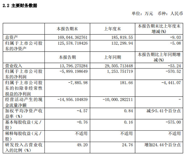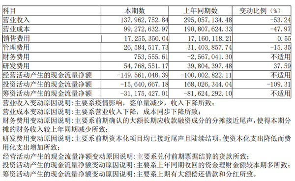 近日,佳华科技披露的2022年半年度报告显示,上半年实现营业收入1.38亿元,和上年同期的2.95亿元相比,减少53.24%;归属于上市公司股东的净利润为-0.59亿元,和上年同期的0.13亿元相比,由盈转亏,出现了570.52%的下降;归属于上市公司股东的扣非净利润亏损0.79亿元,同比减少4441.07%。