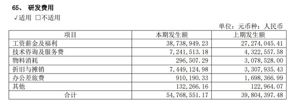 在研发费用的具体情况中,工资薪金及福利3873.89万元比上年同期增加了1146.49万元,增幅达42%,是研发费用所含明细项目中金额增加最多的项目。
