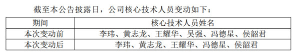 4月30日公告显示,核心技术人员、时任技术总监廖强因个人原因辞去所任职务,解除劳动合同后廖强将不再担任公司任何职务。廖强离职后,其原从事的研发工作由公司研发团队承接,公司的生产运营与技术研发工作均正常开展。廖强的离职不会对公司的核心竞争力和持续经营能力产生实质性的影响。