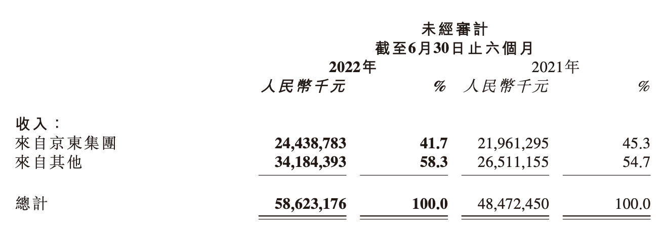 从收入来源看,京东物流上半年的营收中,京东集团贡献的业绩仍超过四成。
