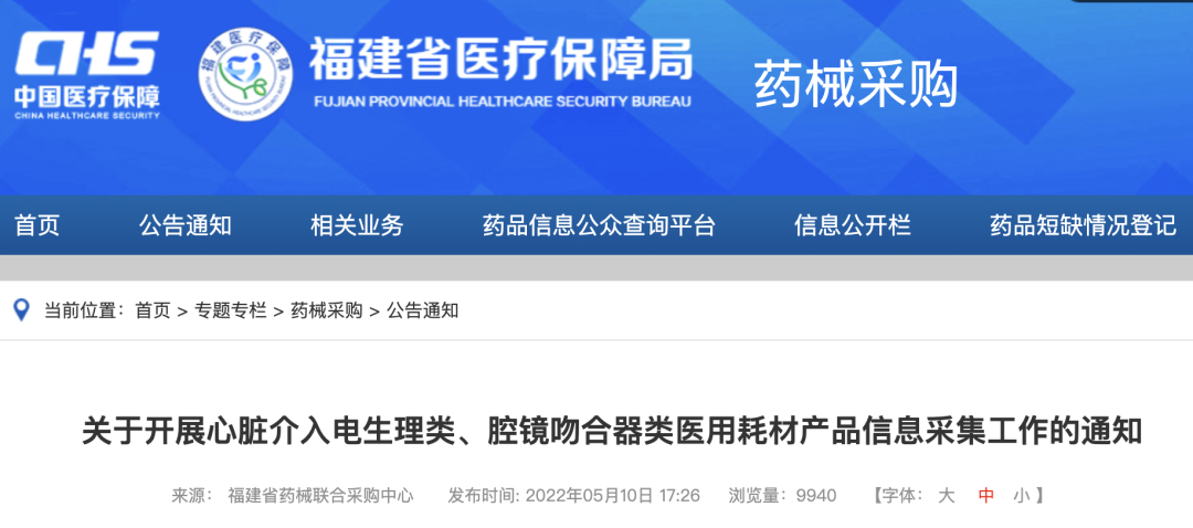 5月10日,福建发布《关于开展心脏介入电生理类、腔镜吻合器类医用耗材产品信息采集工作的通知》,面向企业端采集信息,此后,山西、西藏等地陆续跟进发文,目前应处于医院报量阶段。