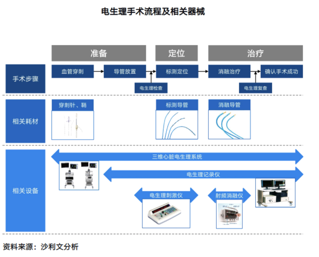 其次,电生理手术非常复杂,分为三个阶段,简单来说就是“标测+消融”——先找到病变位置,然后对其进行消融处理,不同阶段要用到不同的设备和耗材。