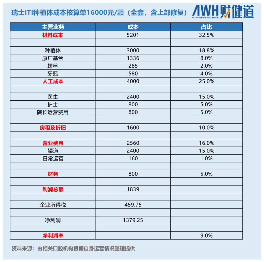 再加上财务、税收等支出,一颗在连锁机构售价16000元/颗(全套,含上部修复)的种植牙,最后利润在1370块左右,净利润率近9%。