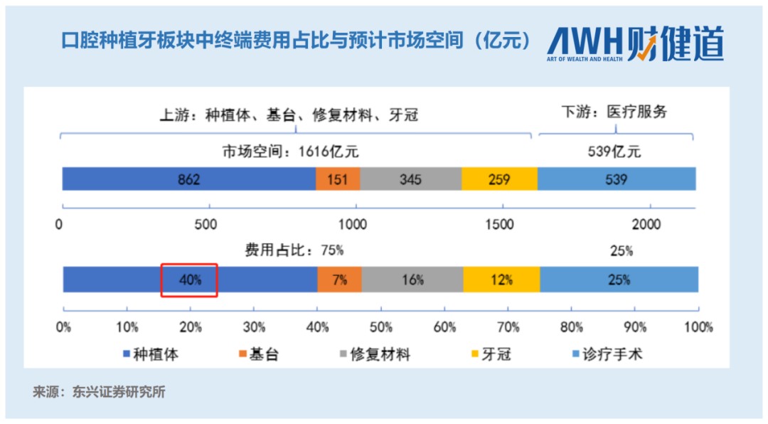 在这当中,让种植牙业务价格居高不下的主要原因之一就是占比最大的耗材的费用。东兴证券研报显示,种植体占到了终端费用的四成。