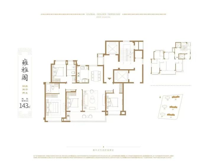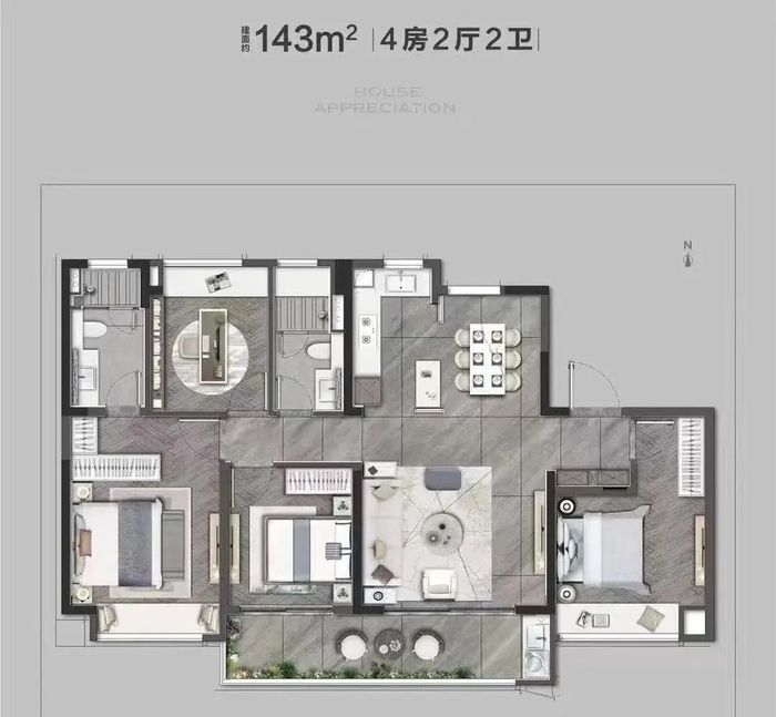 建面约143㎡四室两厅两卫:此户型餐客厅一体,南向3间卧室,均带有飘窗。