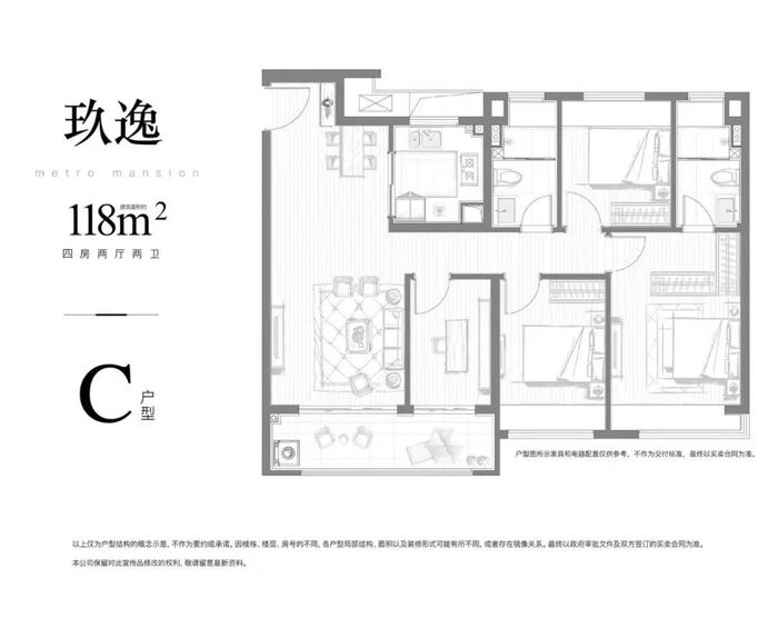 建面约168㎡四室两厅三卫:与建面约143㎡户型格局大致相同,不同的是除了面积更大外,此户型有三个卫生间,朝南的东西两侧的主卧和客卧均配备有独立的卫生间。