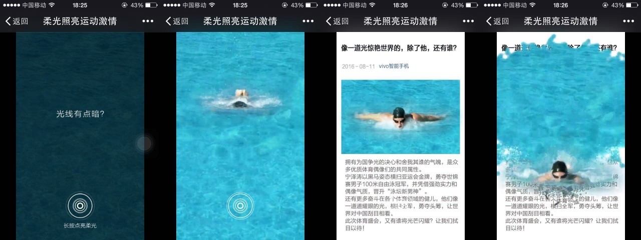 参与感:这个H5的初始画面,引导着用户长按屏幕参与进来。随着泳池中宁泽涛的出现,比赛场面的递进,微信图文消息的定格,再由新闻中游出来的比赛场景,完成了用户体验的第一阶段,即参与感。
