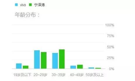 由百度指数提供的人群画像显示,宁泽涛与vivo百度搜索指数最高的区域趋同,多集中在一线城市和沿海地区。二者的粉丝集中在20-29岁、30-39岁年龄段,且男女用户比例相当。由此可以判断,vivo与宁泽涛的粉丝重合度相当高。
