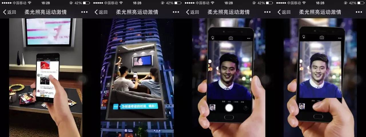 即视感:接着,把游泳比赛场面以小视频形式嵌入朋友圈,场景无缝切换。然后朋友圈晒图、点赞、玩自拍,以及手机“掉”下来,被楼下中国健儿接住,站在红旗下玩自拍。