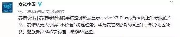 而这种操作手法的效果初现,权威调研机构赛诺基于线下的销售调研数据显示,七月发售以来vivo X7持续热卖,X7Plus上升最快,大小屏的产品组合迅速占据了2500-3000价位段领先地位。同时,vivoX7进入了天猫七月份手机销量排行榜的TOP3,成为暑期热卖的热门手机之一。