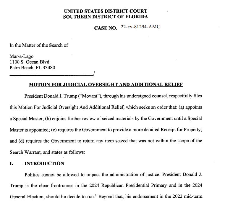 除了要求指派特别主事官外,诉讼书还要求司法部向特朗普提供在海湖庄园扣押物品的详细清单,并退还任何不属于搜查令权限范围内的扣押物品。