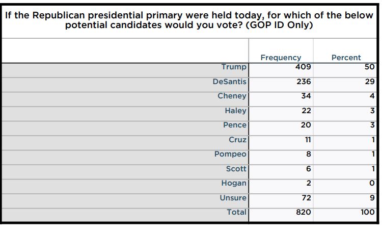 新罕布什尔州圣安塞姆学院上周一公布的民调显示,如果现在举行总统大选党内初选,有50%的共和党选民支持特朗普,支持德桑蒂斯的仅29%。而6月的民调显示特朗普与德桑蒂斯的支持率旗鼓相当。