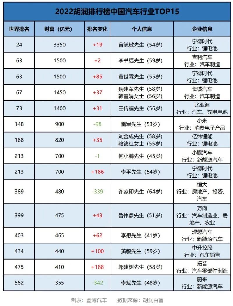 当时,他的长城汽车刚在过去一年间实现营收1364亿元、净利润67.3亿元,较比亚迪的两倍还多。而这位汽车大佬的个人资产也刚得到了《2022胡润排行榜》的验证——魏建军、韩雪娟夫妇的资产达到1450亿元,位列中国汽车行业财富榜第四名、汽车制造行业第二名,位居其前列的仅有宁德时代的曾毓敏、黄世霖以及吉利汽车的李书福。