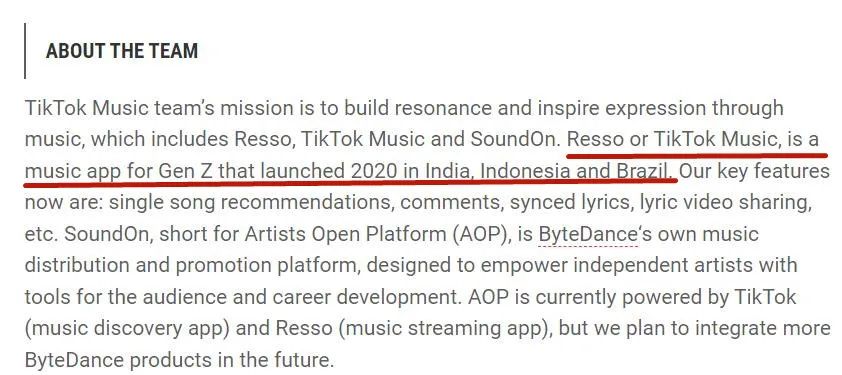 这同样也能被TikTok最近发布的招聘广告所佐证。TikTok正在招聘TikTok Music的后端软件工程师,在公告中表示,该团队的“使命是通过音乐建立共鸣并激发表达,负责产品包括Resso、TikTok Music和SoundOn”,并将TikTok Music界定为“与Resso一样,是Z世代的音乐应用。”