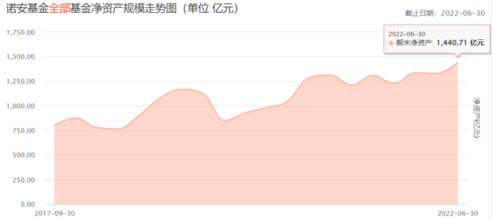 根据天天基金网披露的数据,截至2022年6月30日,诺安基金的公募管理总规模为1440.71亿元,相对于2021年同期1308.4亿元的数据,在管理规模上同比增长10.11%。