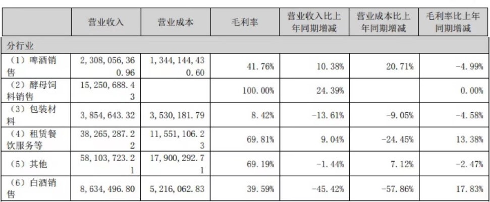 今年上半年,珠江啤酒的啤酒销售业务营收同比增长10.38%,但毛利率却同比下滑4.99%,导致公司整体盈利能力减弱。