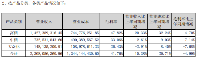 从产品品类来看,今年上半年珠江啤酒仅高档啤酒的营收同比增长,中档、大众化啤酒营收均出现小幅下滑。其中高档啤酒的毛利率最高,为47.82%。