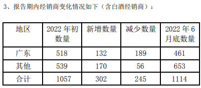 由于啤酒运输成本较高,因此珠江啤酒的主要销售地区为广东。半年报显示,珠江啤酒在华南地区的营收占总营收的92.38%。从经销商数量来看,截至6月末公司共有1114家经销商,其中461家位于广东。