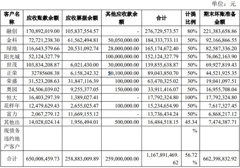 蒙娜丽莎的计提减值明细显示,融创、金科、恒大、富力等知名房企均在列。从计提比例来看,恒大的计提比例最高,为100%;其次为融创80%;其余金科、绿地、阳光城、世茂等企业计提比例多为50%。