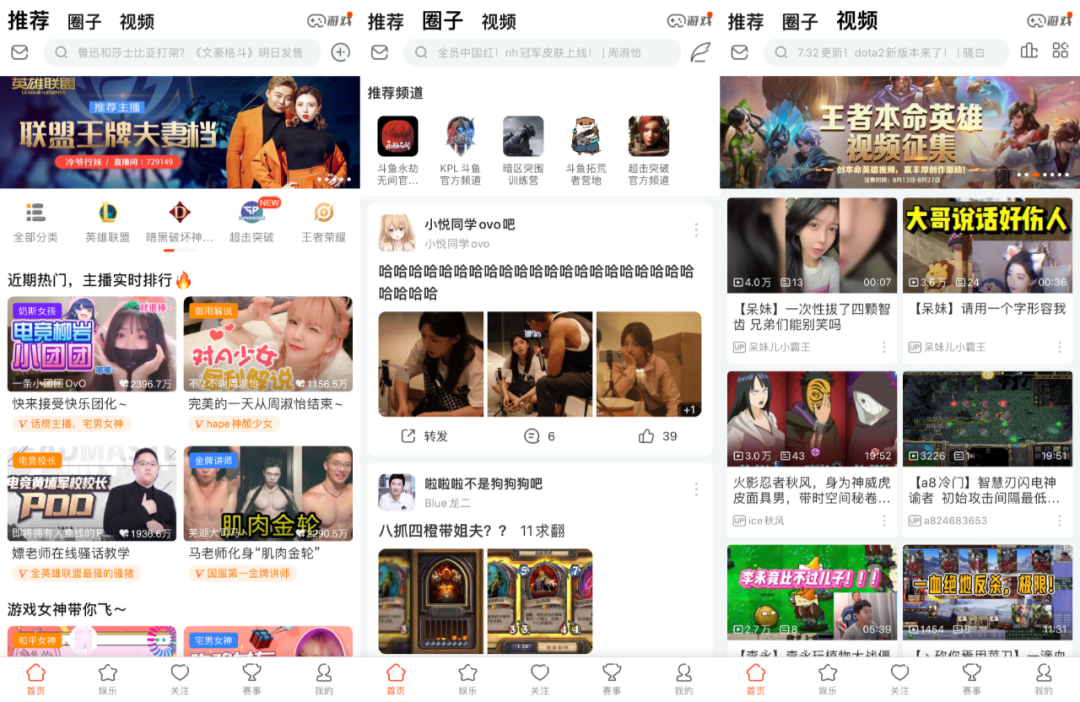 斗鱼APP如今有“推荐”、“圈子”、“视频”三个一级分区。“推荐”对应直播,“圈子”分区下则为用户推送来自的“鱼吧”信息。“鱼吧”是斗鱼主播仿照贴吧的形式建立的兴趣专区,斗鱼以此构建属于玩家的讨论社区。“视频”分区下则为用户推送PUGC创作者制作的视频内容。