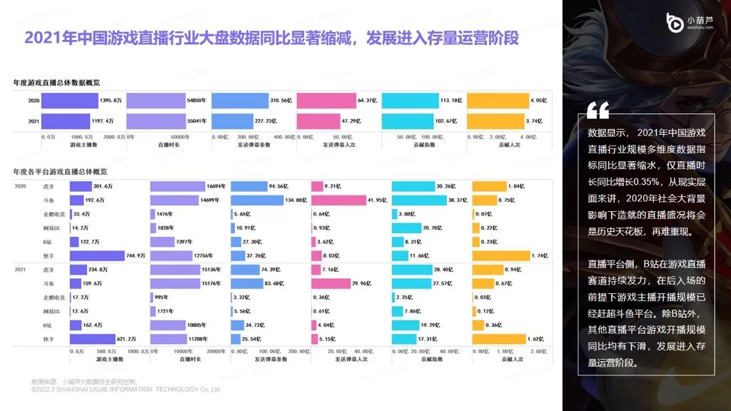据小葫芦数据研究院,在2021年,中国游戏直播行业多项大盘数据指标显著缩水。与2020年相比,2021年游戏直播弹幕条数由310.56亿下降至227.23亿,而用户贡献指数由113.18亿下降至102.67亿。游戏直播用户互动和付费的意愿都有显著降低。
