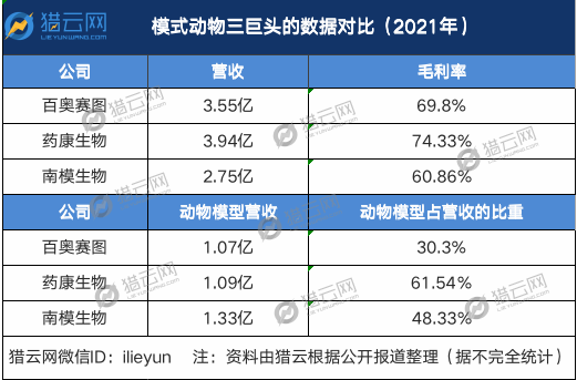 从营收来看。2021年,百奥赛图销售收入达3.55亿元,药康生物实现营业收入3.94亿元,南模生物实现营收2.75亿元。