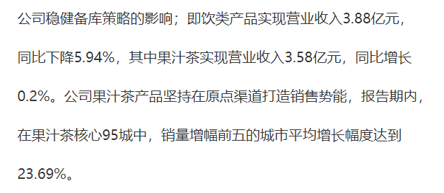 营收下滑主要集中在其核心业务的冲泡类产品上。相比新业务即饮类产品,冲泡产品仅实现4.53亿元的营业收入,同比下滑31.37%。